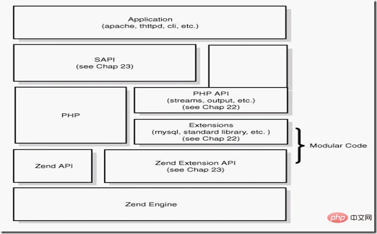 Zend整体用纯c实现,是php的内核部分,它将php代码翻译(词法、语法解析等一系列编译过程)为可执行opcode的处理并实现相应的处理方法、实现了基本的数据结构(如hashtable、oo)、内存分配及管理、提供了相应的api方法供外部调用,是一切的核心,所有的外围功能均围绕zend实现。