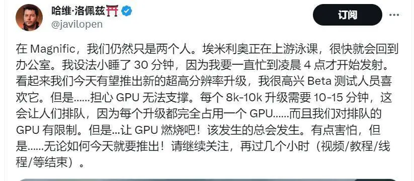 1月10日消息,magnific ai创始人哈维·洛佩兹表示,尽管团队规模依然只有两个人,但近期他们发布了新的升级内容,为用户提供了一系列新功能和改进,以增强用户体验。这次升级的重点是将输出尺寸提升到10k*10k大小,使用户能够将图像放大8倍而不会出现失真或模糊。这一改进将为用户提供更高质量的图像放大体验。