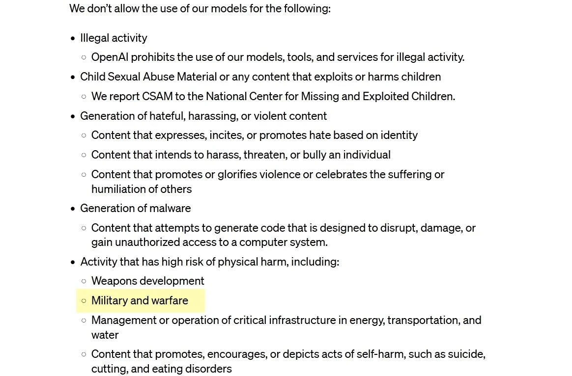 不过,新政策保留了不得“使用其服务伤害自己或他人”的禁令,并以“开发或使用武器”为例,但“军事和战争”这个更全面的禁令已经不复存在。