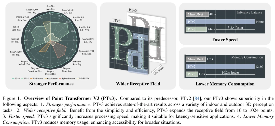 图 1.Point Transformer V3 (PTv3) 概述。与其前身PTv2[84]相比,本文的PTv3在以下方面表现出优越性:1.性能更强。PTv3 在各种室内和室外 3D 感知任务中均取得了最先进的结果。2.更宽的感受野。受益于简单性和效率,PTv3 将感受野从 16 点扩展到 1024 点。3、速度更快。PTv3 显着提高了处理速度,使其适合对延迟敏感的应用程序。4. 降低内存消耗。PTv3 减少了内存使用量,增强了更广泛情况下的可访问性。