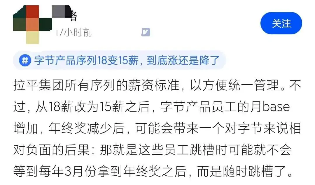 还有细心的网友认为,18薪改为15薪,可能也会给字节带来一个风险:不会因为被3月的年终奖发放拖着就可能跳槽了。