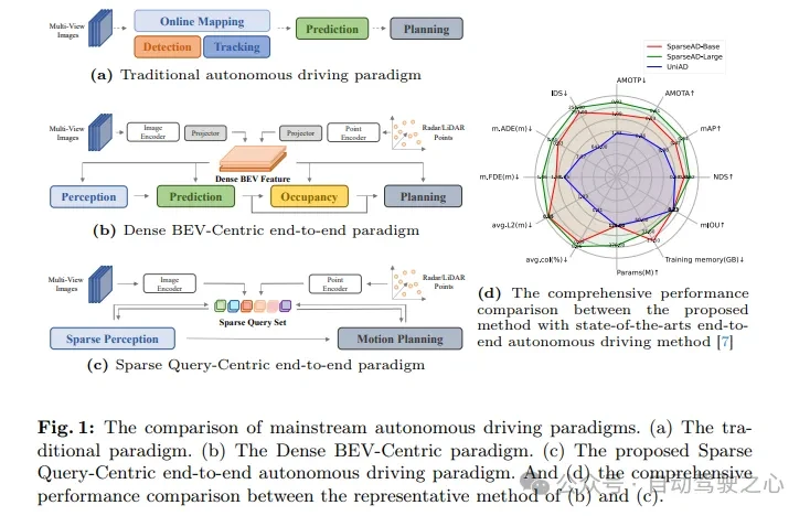 根据图1b所示,在大多数先进的模块化端到端方法中,整个驱动场景通过密集集合的鸟瞰图(BEV)特征进行表征,这些特征包括多传感器和时间信息,并作为全栈驱动任务(包括感知、预测和规划)的输入。尽管密集集合的BEV特征在跨空间和时间的多模态和多任务中实现了关键作用,将之前使用BEV表示的端到端方法总结为Dense BEV-Centric范式。尽管这些方法具有简洁性和可解释性,它们在自动驾驶的每个子任务上的性能仍然远远落后于相应的单任务方法。此外,在Dense BEV-Centric范式下,长期时间融合和多模态融合主要是通过多个BEV特征图来实现,这导致了计算成本、内存占用显著增加,给实际部署带来了更大的负担。