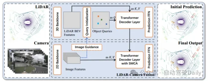 - 为对象查询引入了几个简单而有效的调整,以提高图像融合的初始边界框预测的质量,还设计了一个图像引导查询初始化模块来处理在点云中难以检测到的对象;