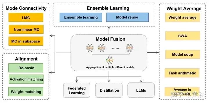 针对独立训练且彼此不相邻的模型,“模式连接”和“对齐”使解决方案更加接近,从而获得更好的平均原始条件。对于权重空间存在一定差异的相似模型,“权重平均(WA)”倾向于直接对模型进行平均,在损失函数值较低的参数空间区域中获得更接近最优点的解决方案。此外,对于现有模型的预测,“集成学习”整合了模型的不同形式的预测,以获得更好的结果。