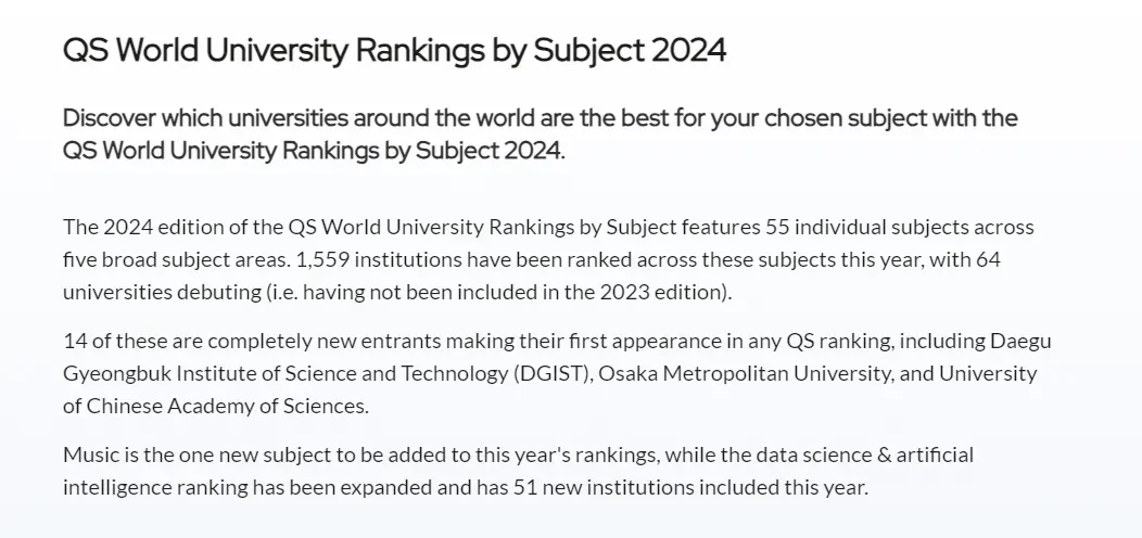 据精分学科来说,音乐(Music)是今年推出的新科目。此外,数据科学和人工智能排名得到了扩充,排名新加入了51所高校。