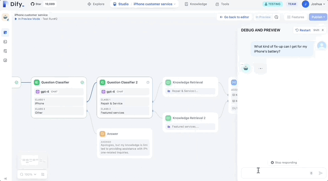 并且workflow中可以利用Dify平台的全部能力,用户已经设置好检索方案的知识库、平台提供的第一方丰富工具、自定义的工具等,都能作为其中一个节点能力编排。