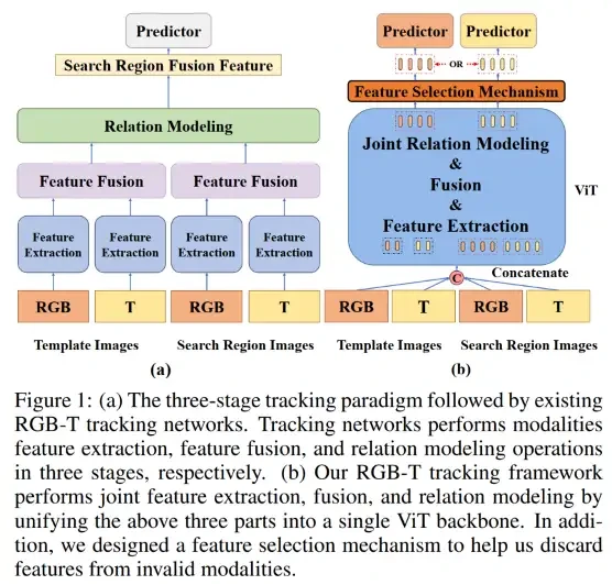本文介绍了一种基于Transformer的高效单阶段RGB-T单目标跟踪网络USTrack。其核心是通过联合特征提取、融合和关联建模方法,将三阶段融合跟踪方法的三个功能部分直接统一到一个ViT主干网络中同时执行,从而实现在模态交互下直接提取目标模板和搜索区域的融合特征,并构建两个融合特征之间的关联建模,从而大大提升了跟踪速度和精度。此外,USTrack还设计了一个基于模态可靠性的特征选择机制,该机制通过直接抑制无效模态的产生,可以减少无效模态的干扰,从而减少噪声信息对最终跟踪结果的影响。最终,USTrack创造了当前RGB-T单目标跟踪中最快的速度84.2FPS,并通过两个模态图像中目标的微小位置偏差以及减轻无效模态信息对跟踪结果的影响,大大减少了噪声信息对最终预测结果的影响。