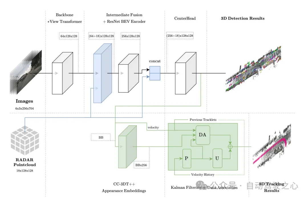 传感器融合架构 提出的CR3DT在BEV编码器的前后均使用中间融合技术来集成毫米波雷达数据;而在跟踪上,采用一种准密集外观嵌入头,使用毫米波雷达的速度估计来进行目标关联。