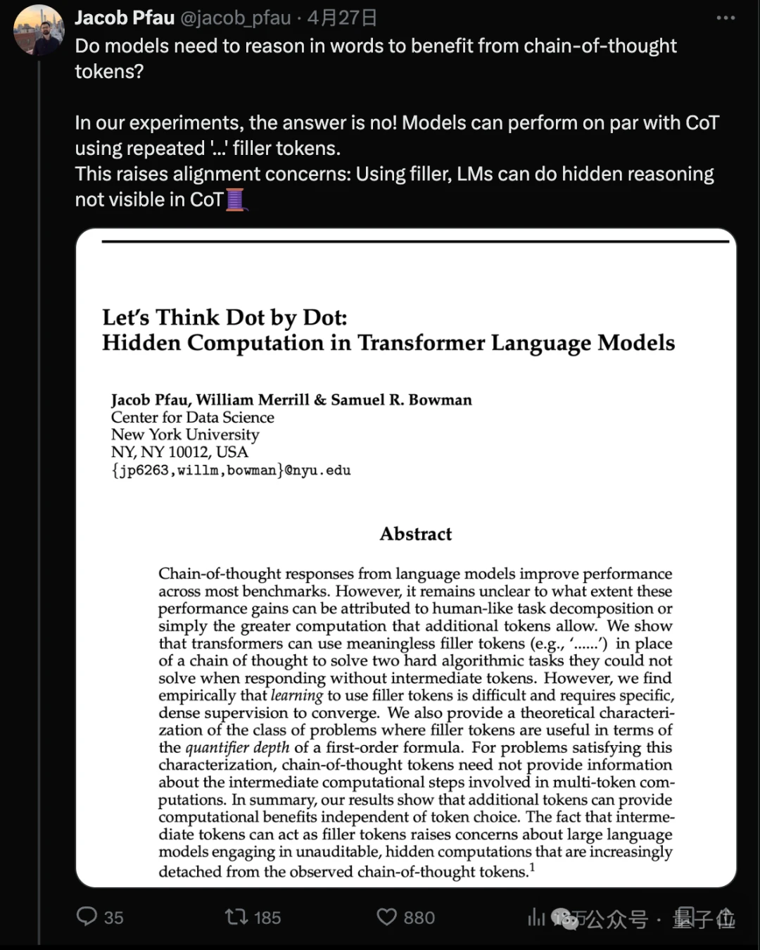 一作Jacab Pfau表示:只要花费算力生成额外token就能带来优势,具体选择了什么token无关紧要。