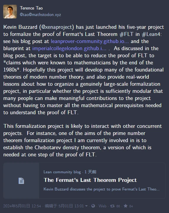 这位 Buzzard 教授,就是最近宣称要形式化费马大定理证明的数学家,他所用的工具也是 Lean。