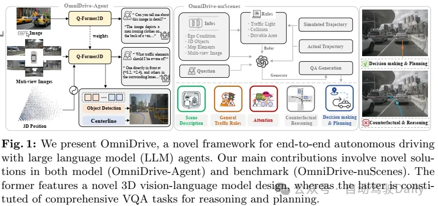 多模态大语言模型(MLLMs)的发展导致了对基于LLM的自动驾驶的兴趣不断增长,利用它们强大的推理能力。利用MLLMs强大的推理能力来改进规划行为是具有挑战性的,因为它们需要超越2D推理的完整3D情境意识。为了解决这一挑战,本工作提出了OmniDrive,这是一个关于智能体模型与3D驱动任务之间强大对齐的全面框架。框架从一个新颖的3D+MLLM架构开始,该架构使用稀疏查询将观察表达提升和压缩到3D,然后将其输入LLM。这种基于查询的表达允许我们联合编码动态对象和静态地图元素(例如,交通道路),为3D中的感知-行动对齐提供了一个简洁的世界模型。进一步提出了一个新的基准,其中包括全面的视觉问答(VQA)任务,包括场景描述、交通规则、3D基础、反事实推理、决策制定和规划。广泛的研究表明,OmniDrive在复杂的3D场景中具有出色的推理和规划能力。