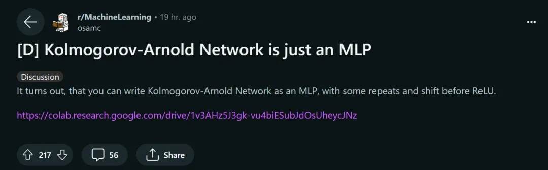 「是的,这显然是一回事。他们在 KAN 中先做激活,然后再做线性组合,而在 MLP 中先做线性组合,然后再做激活。将其放大,基本上就是一回事。据我所知,使用 KAN 的主要原因是可解释性和符号回归。」