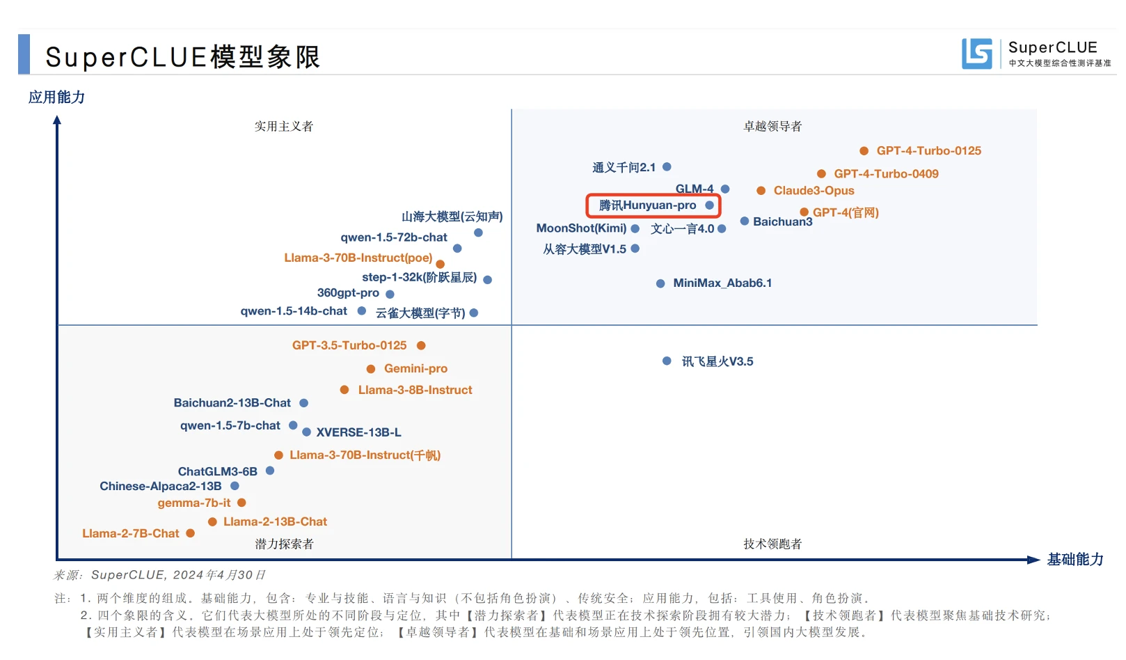 记者5月6日报道,国内权威的大模型评测机构superclue最新发布了《中文大模型基准测试2024年度第4季度报告》。其中,腾讯混元大模型位列国内大模型第一梯队,基础和场景应用上均处于领先位置,位于卓越领导者象限。