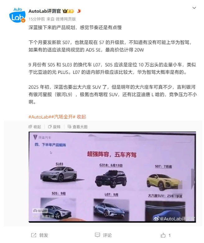 6月14日消息,车媒“AutoLab”今日曝光了长安旗下深蓝汽车的产品规划图。据悉,除了新近上市的硬派越野车型G318,深蓝汽车还将对其现有的SUV S7和轿车SL03进行升级。这两款车型的升级版预计将分别于7月底和9月份以S07和L07的名称面市。
