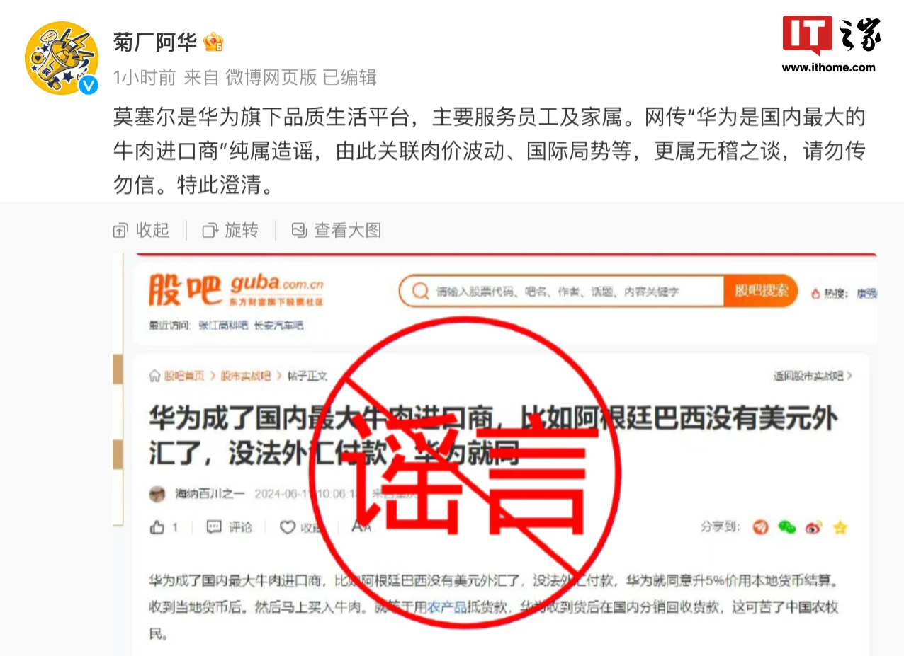 本站 6 月 14 日消息,近期网传“华为是国内最大的牛肉进口商”,对此华为官方微博 @菊厂阿华 进行回应,表示该消息纯属造谣。