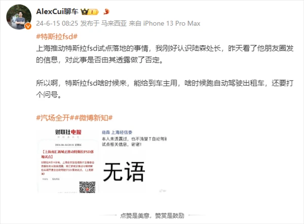 6月15日消息,近日,关于特斯拉自动驾驶系统(fsd)进入中国市场的消息再次引起广泛关注。有报道称,上海临港新片区正处于推动特斯拉fsd的落地试点,涉及10辆特斯拉车辆。然而,该消息很快遭到上海临港新片区管委会数据处处长森谣的辟谣,他表示并未透露过相关信息。