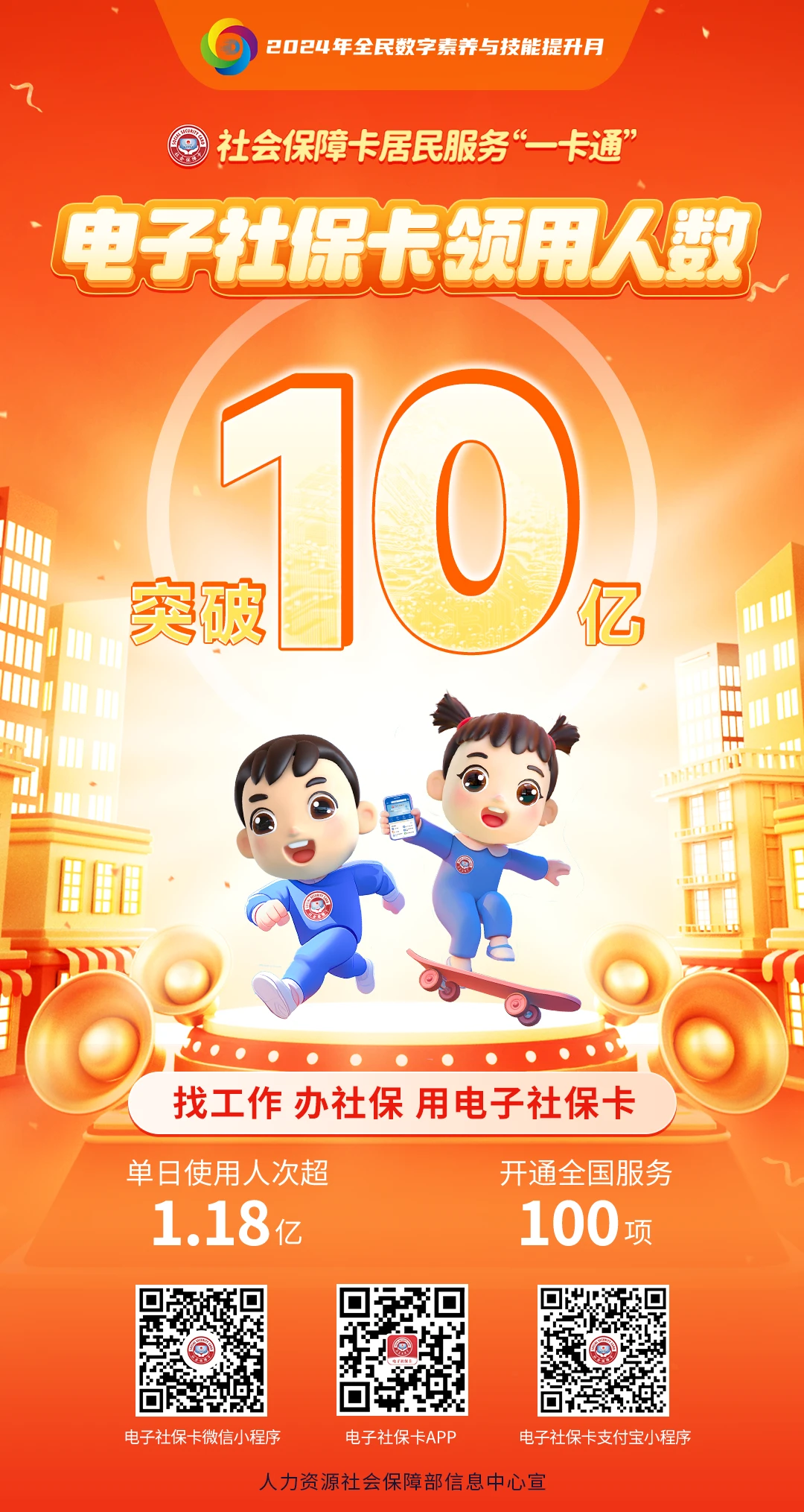电子社保卡已开通全国服务 100 项、属地服务 1000 余项、服务渠道 432 个,单日使用人次超 1.18 亿,累计服务人次超 500 亿。