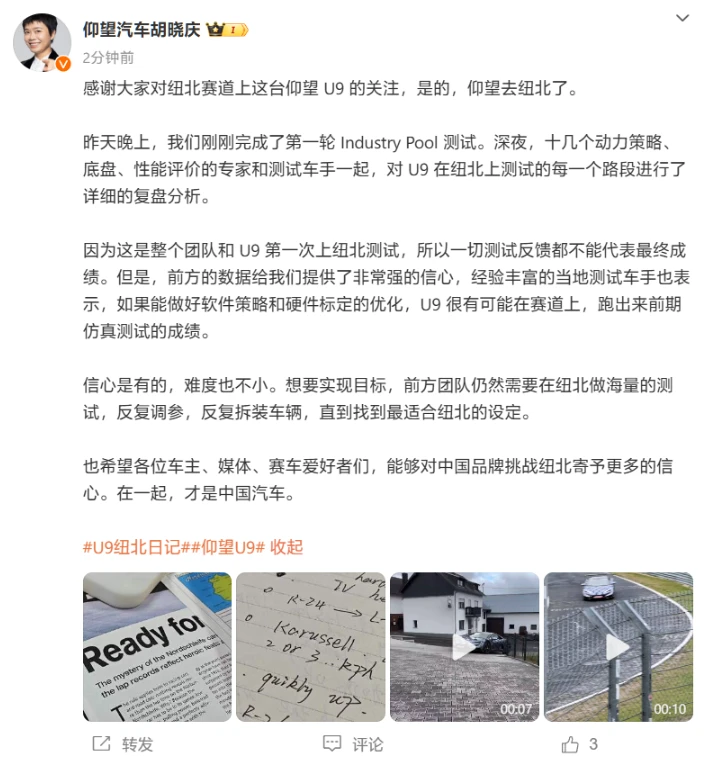 胡晓庆在文中透露,团队在14日晚刚刚完成了第一轮Industry Pool测试。当晚,由动力策略、底盘、性能评价的专家和测试车手组成的十余人团队,对U9在纽北测试的各个路段表现进行了详尽的复盘与分析。他强调,尽管这是团队和U9首次在纽北进行测试,所有的反馈并不能代表最终成绩,但初步的数据结果为团队注入了强烈的信心。