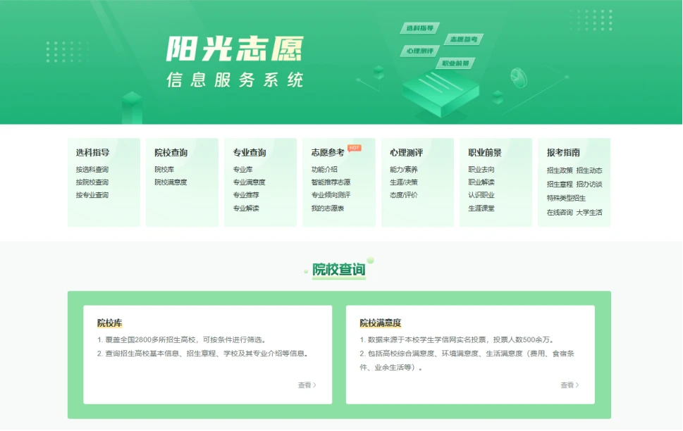 本站获悉,该系统基于招生、就业、调查、测评等大数据,结合深度专业和职业解读,提供志愿推荐、专业介绍、心理测评、就业去向及前景查询等服务。