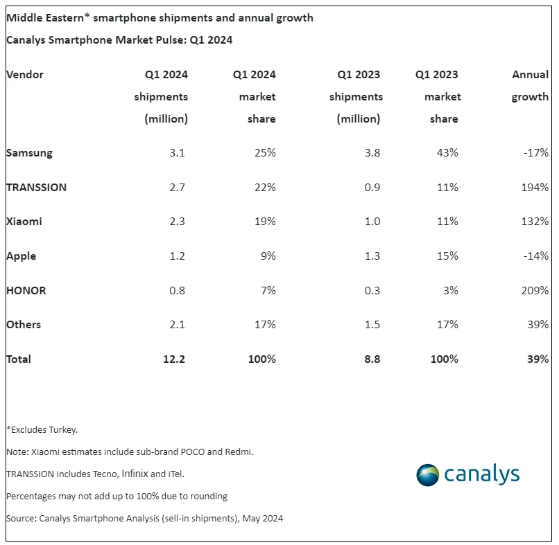 6月17日消息,根据市场研究机构canalys的最新报告,中东地区(不含土耳其)在2024年第一季度智能手机出货量显著增长,总计达到1220万部,同比激增39%。在这一增长趋势中,荣耀、传音和小米成为亮点,它们分别以惊人的209%、194%和132%的同比增长率领跑市场。