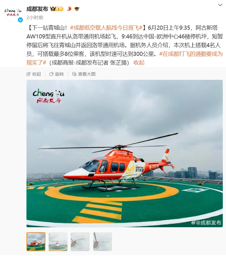 本站 6 月 20 日消息,据成都商报,四川省成都市今日开启两条城市低空载人出行验证飞行航线。9 点 35 分,直升机从洛带通用机场起飞抵达中国-欧洲中心,短暂停留后飞往青城山,并返回洛带通用机场。