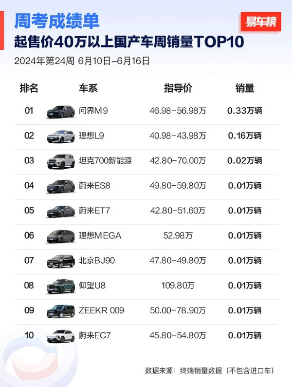 6月22日消息,近日易车网公布了40万以上国产车周销量排行榜,该数据涵盖了6月10日至6月16日的销售情况。