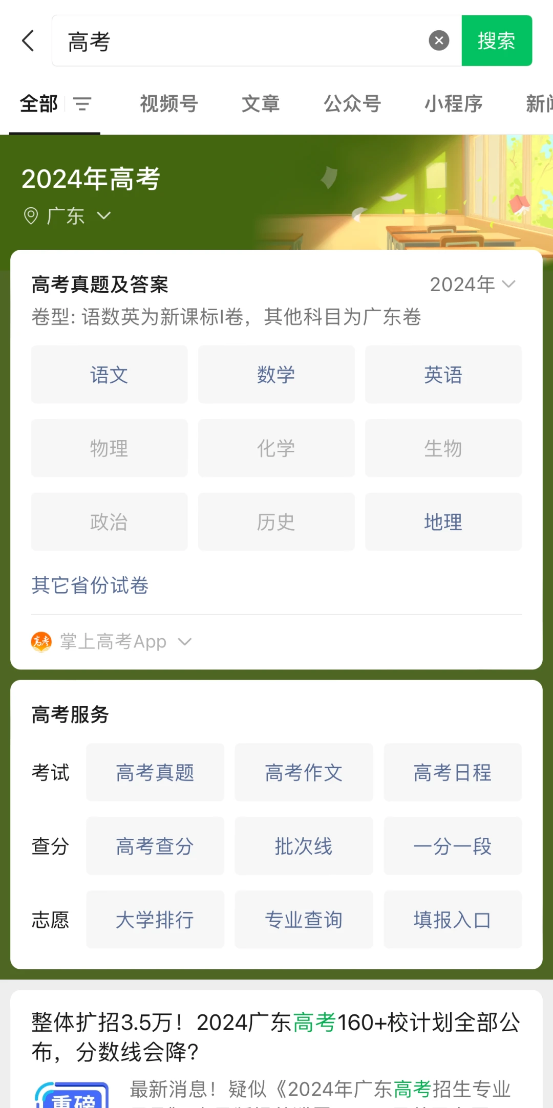 本站 6 月 24 日消息,微信今日宣布推出速查高考分路径,提供高考成绩、分数线、报考指南等信息“一条龙”查询服务,具体查询渠道如下: