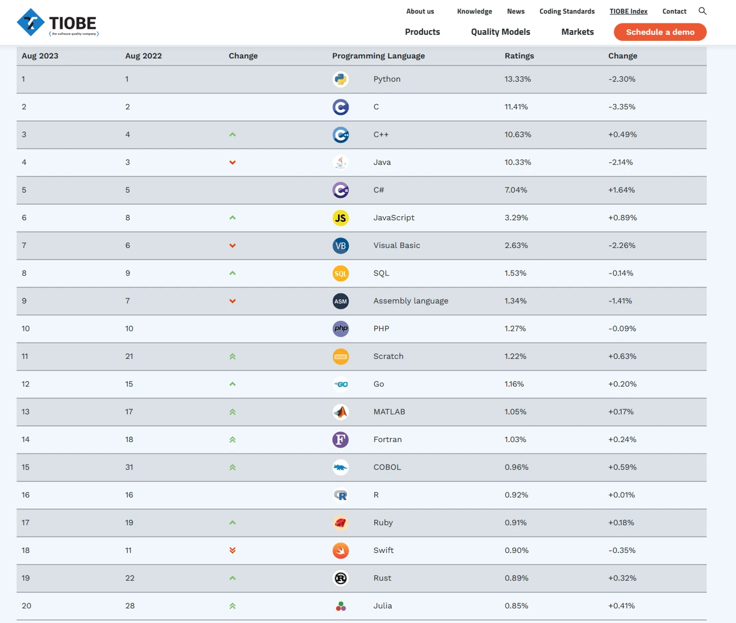 本站8月7日消息,tiobe编程社区指数是一个衡量编程语言受欢迎程度的指标,评判的依据来自世界范围内的工程师、课程、供应商及搜索引擎,tiobe官网近日公布了2023年8月的编程语言排行榜。据悉,c++olor:#f60; text-decoration:underline;' href="https://www.php.cn/zt/15730.html" target="_blank">python依然排行第一,占比13.33%、c语言排行第二,占比11.41%、c++排行榜单第三,占比为10.63%,相比c语言,差距为0.78%。除此之外,java排行第四位,占比10.33%、c#排行第五位,占比7.04%、javascript在本月依然保持榜单第六位,为3.29%。本站附系列榜单如下: