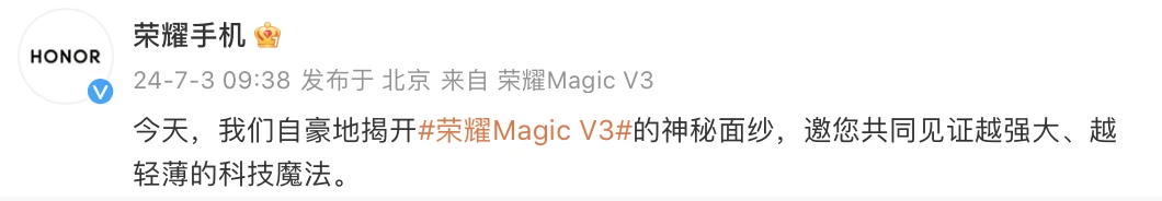 结合“越强大越轻薄”的产品 slogan,简单猜测,荣耀 Magic V3 这次将兼顾轻薄的同时做到“全能”,非常值得期待。