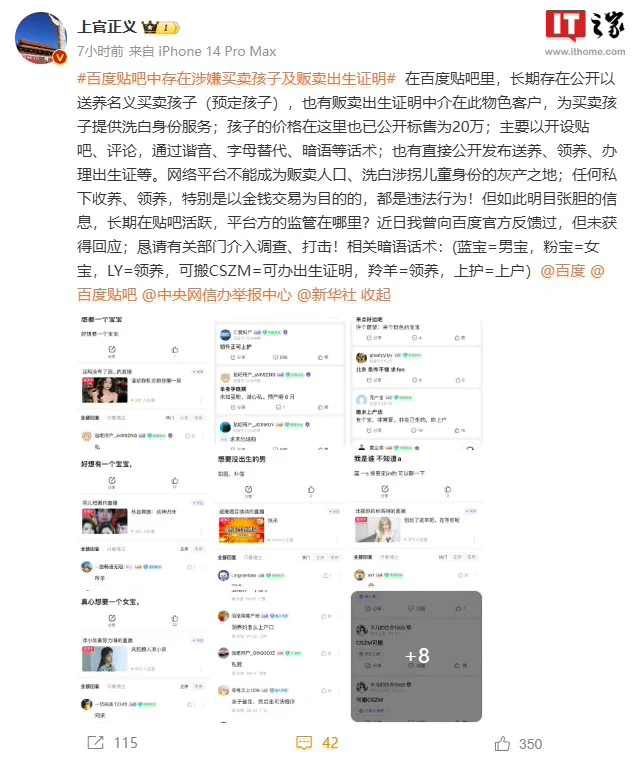本站 7 月 3 日消息,关于媒体报道贴吧有“送养孩子”相关违规内容,百度贴吧表示非常重视并持续进行内容清理和封禁,同时联动有关部门坚决打击。据本站此前报道,打拐志愿者 @上官正义 曾在微博发文称,在百度贴吧里长期存在公开以送养名义买卖孩子(预定孩子),也有贩卖出生证明中介在此物色客户,为买卖孩子提供洗白身份服务。百度贴吧官方当时曾进行过回应,表示将移交证据至公安机关进行查证打击。