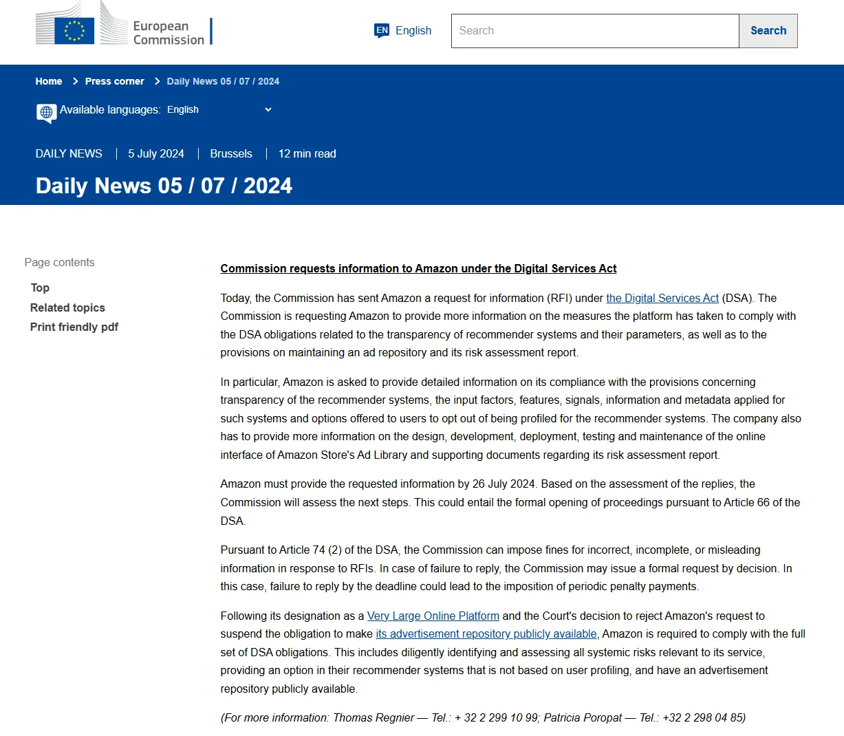 - 如亚马逊未及时回复,欧盟委员会将发布正式命令要求回复。