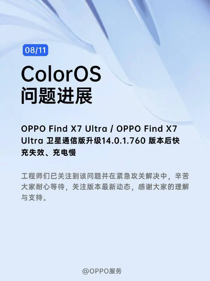 【itbear】8月11日消息,近日,oppo官方“oppo 服务”渠道发布公告,针对部分用户反馈的oppo find x7 ultra及oppo find x7 ultra 卫星通信版在升级至14.0.1.760版本系统后出现的快充功能失效及充电速度变慢的问题,表示工程师团队已关注到此情况,并正在紧急处理中,力求迅速解决用户困扰。