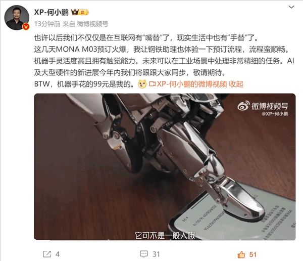 【itbear】8月12日消息,小鹏汽车董事长何小鹏近日发布了一段视频,宣布了一个令人兴奋的新进展:“今后,我们不仅在互联网上有‘代言人’,现实生活中也有了‘执行者’。”这一言论预示着小鹏汽车在机器人技术领域取得了新的突破。据何小鹏介绍,近期mona m03的预订情况异常火爆,他甚至让自己的钢铁助理亲自体验了一把预订流程,整个过程流畅无阻。这一体验不仅证明了预订系统的便捷性,也侧面展示了小鹏汽车在机器人技术方面的深厚积累。据itbear了解,小鹏汽车所研发的机器手展现出了极高的灵活度和触觉能力,预示着它将在未来的工业场景中扮演重要角色,能够处理各种精细任务,其灵活度和触觉能力均可与人手相媲美。视频中的机器手手指弯曲自如,甚至能够精准触摸并操控手机屏幕,这一表现令人印象深刻。