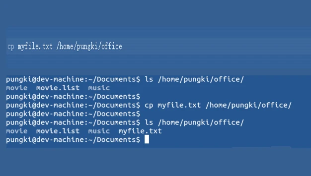 1、首先复制一个文件,需要找到这个文件所在的位置,找到之后用cp命令来进行复制,也可以输入路径来进行复制,以名为myfile.txt来为例,文件在/home/pungki/Documents目录里面,需要在文件地址输入cp命令从而实现。