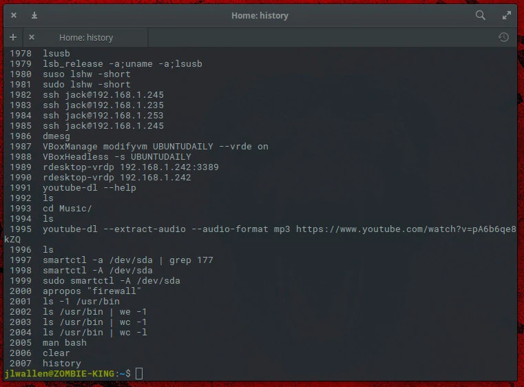 说到 Bash 的命令历史,如果你执行命令 history,你可以列出你过去执行过的命令列表(图 1)。