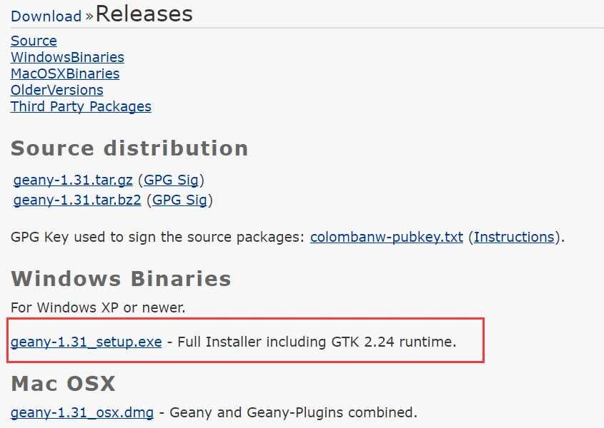 点击链接https://www.geany.org/Download/Releases,进行下载,我的机器是安装的Windows 10 的操作系统,所以下面我就介绍Windows 10 下的Geany的下载安装问题。