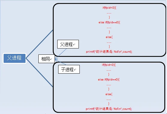 在语句fpid=fork()之前,只有一个进程在执行这段代码,但在这条语句之后,就变成两个进程在执行了,这两个进程的几乎完全相同,将要执行的下一条语句都是if(fpid