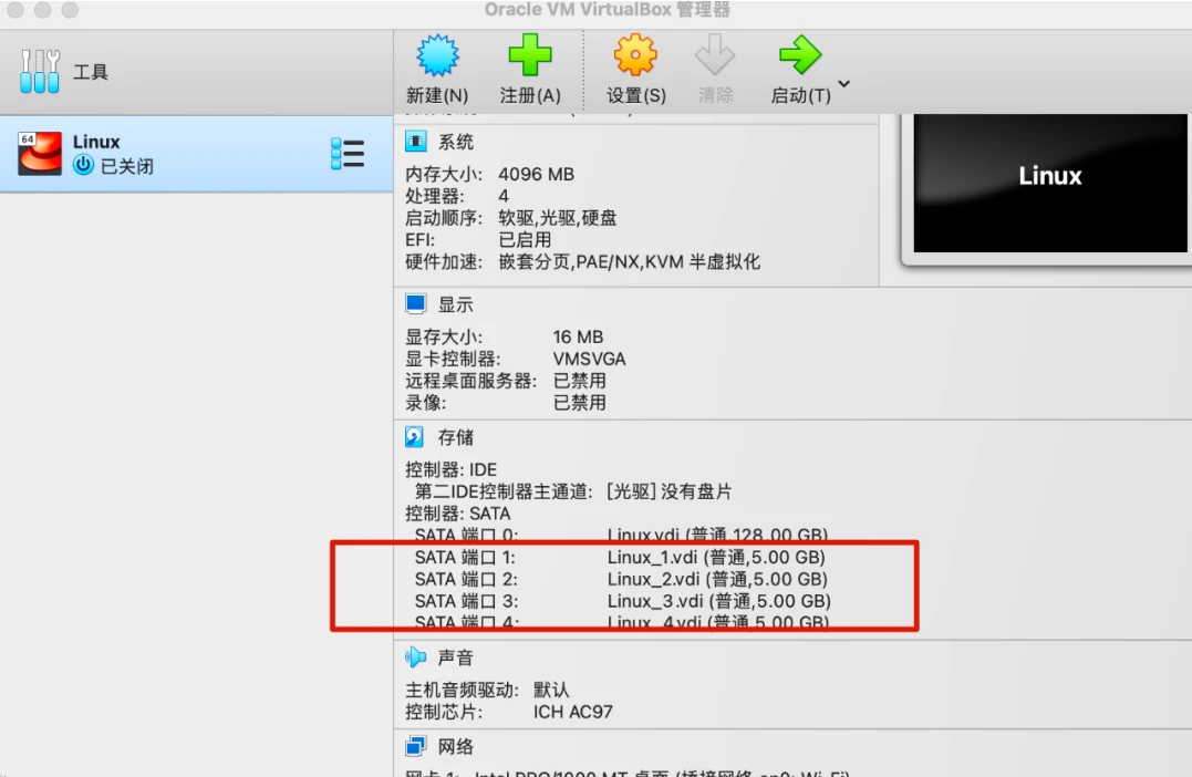 使用Oracle VM VirtualBox虚拟机,安装一个最小版本的Linux,然后添加4块虚拟盘,用于充当MinIO的虚拟盘。