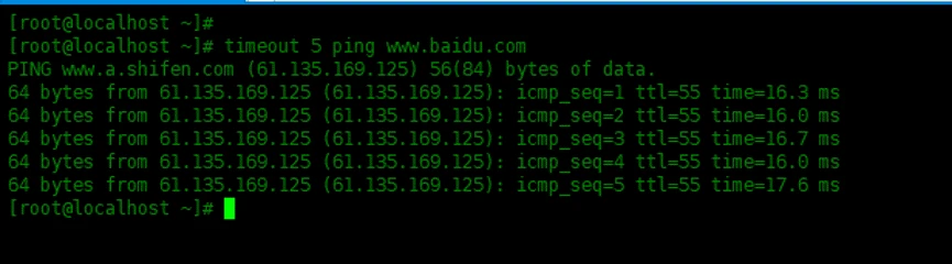 [root@localhost ~]# timeout 5 ping www.baidu.com PING www.a.shifen.com (61.135.169.125) 56(84) bytes of data. 64 bytes from 61.135.169.125 (61.135.169.125): icmp_seq=1 ttl=55 time=16.3 ms 64 bytes from 61.135.169.125 (61.135.169.125): icmp_seq=2 ttl=55 time=16.0 ms 64 bytes from 61.135.169.125 (61.135.169.125): icmp_seq=3 ttl=55 time=16.7 ms 64 bytes from 61.135.169.125 (61.135.169.125): icmp_seq=4 ttl=55 time=16.0 ms 64 bytes from 61.135.169.125 (61.135.169.125): icmp_seq=5 ttl=55 time=17.6 ms