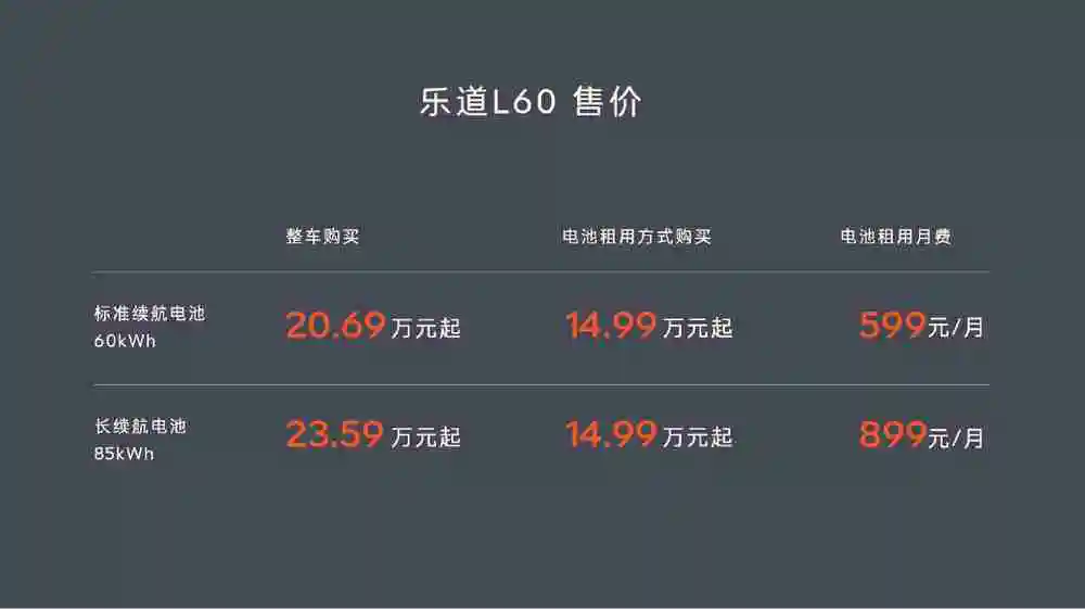 9月19日,蔚来全新品牌乐道的首款车型——乐道l60正式上市。乐道l60定位家庭智能电动suv,标准续航60kwh,售价20.69万元;长续航85kwh,售价23.59万元。