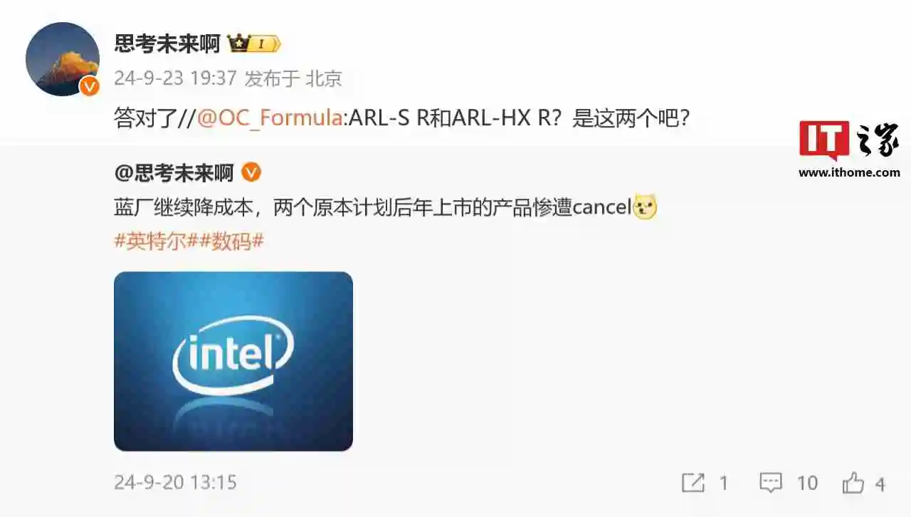 联想产品经理 @思考未来啊 在微博进一步确认,英特尔将取消 arrow lake-s refresh 和与之同源的 arrow lake-hx refresh 处理器。
