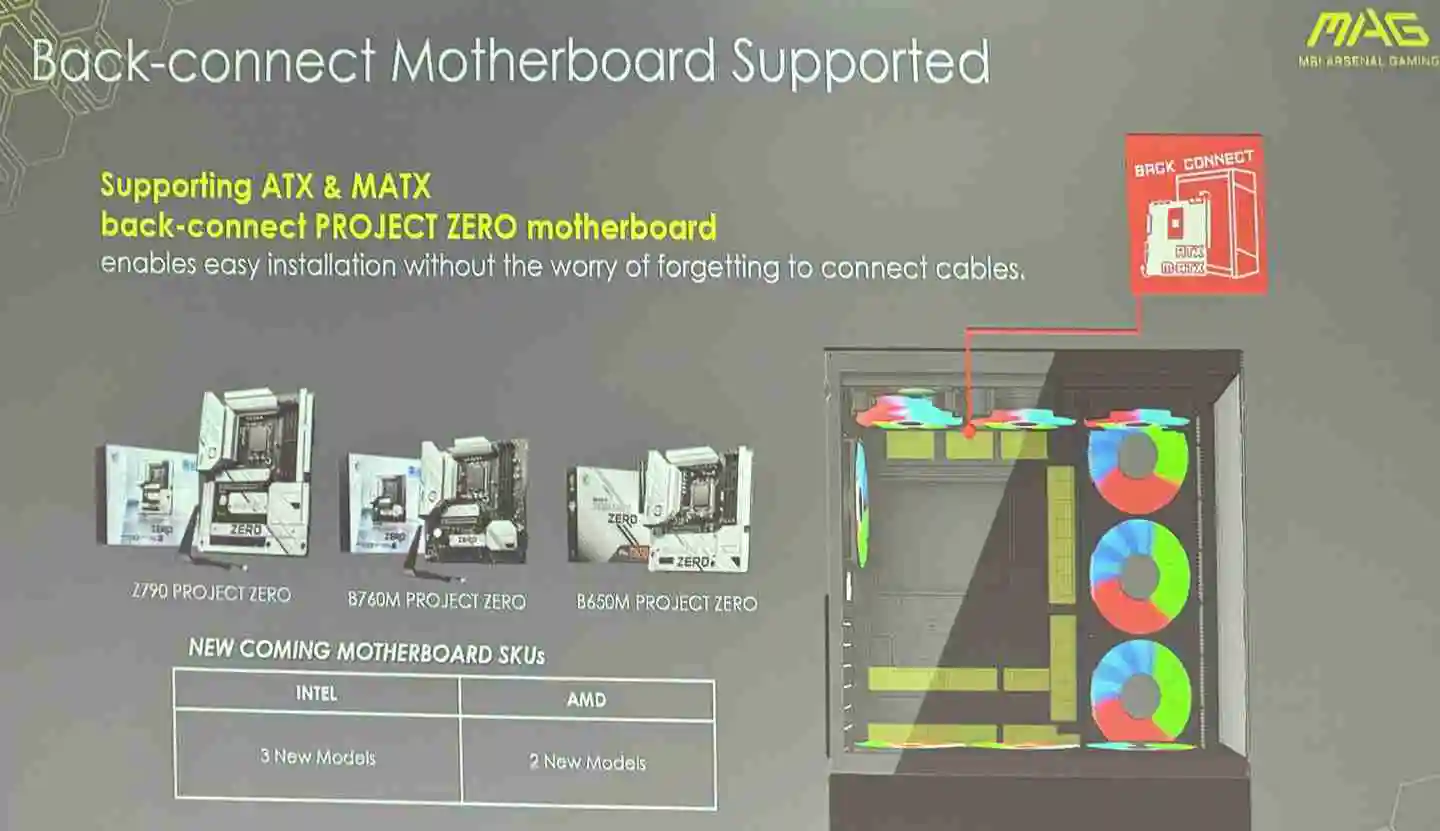 本站 9 月 23 日消息,法媒 cowcotland 近日造访微星深圳工厂。该媒体注意到,在展示机箱新品 mag pano 110r pz 的幻灯片中,微星表示即将推出多款 project zero 主板,丰富背插系列产品。