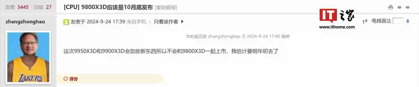 本站 9 月 26 日消息,综合 chiphell 论坛网友 zhangzhonghao、台媒 benchlife.info、x 平台消息人士 hoang anh phu (@anhphuh) 三方面消息,amd 锐龙 7 9800x3d 处理器有望于今年四季度推出,早于此前预估的 2025 年。