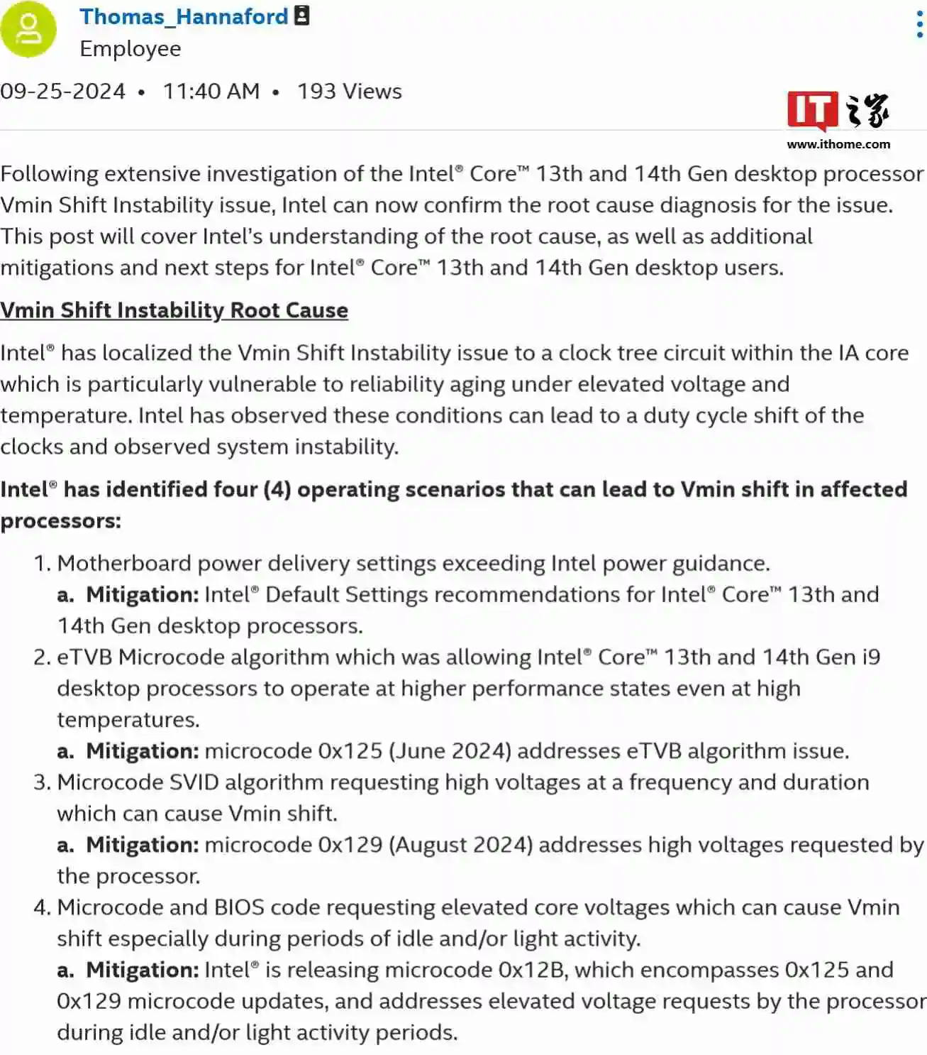 本站 9 月 26 日消息,英特尔员工 thomas hannaford 当地时间 25 日在英特尔官网社区发帖,表示英特尔已确认第 13、14 代酷睿桌面处理器不稳定的根本原因,未来将推出进一步修复问题的 0x12b 版本微代码。