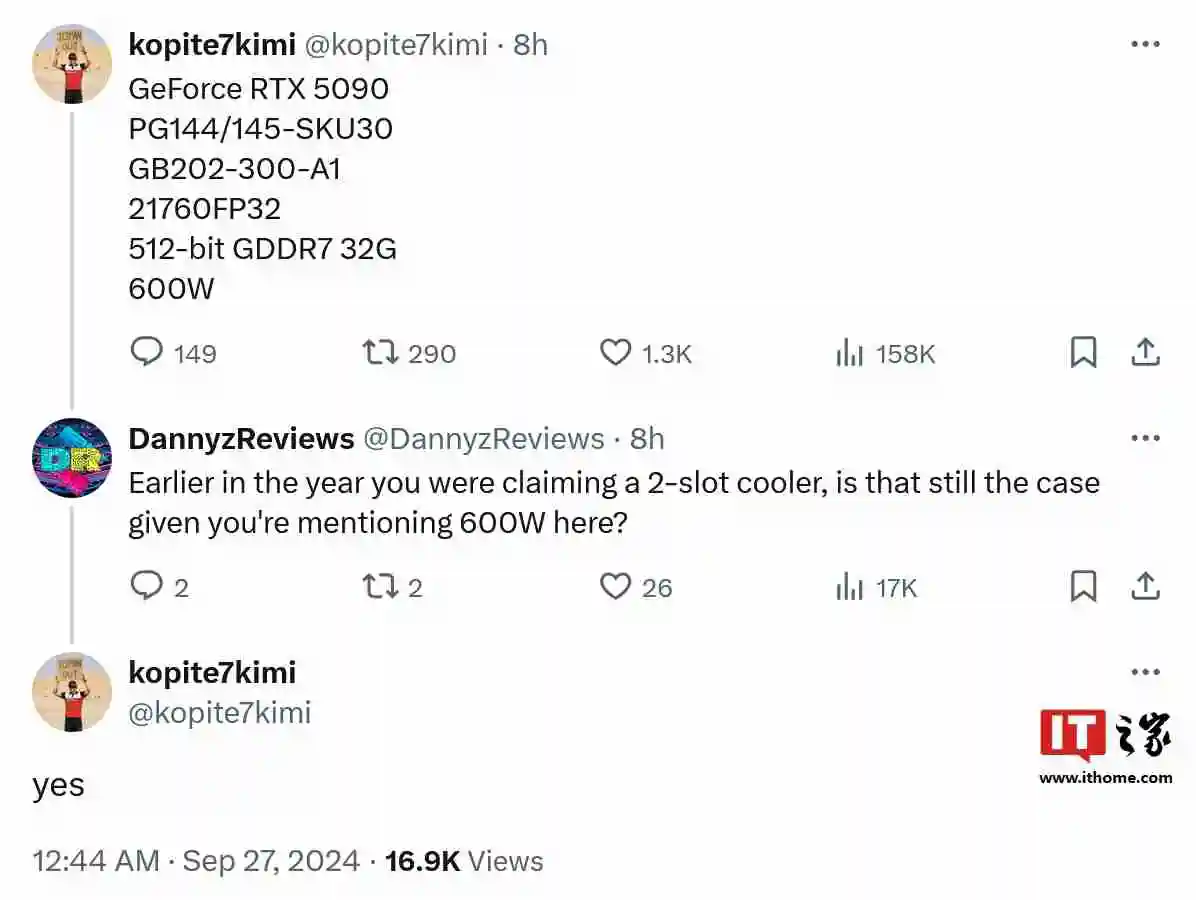 本站 9 月 27 日消息,x 平台消息人士 kopite7kimi 北京时间今日曝光了英伟达 geforce rtx 5090 / 5080 两张未来 blackwell 世代高规格游戏显卡的详细规格。
