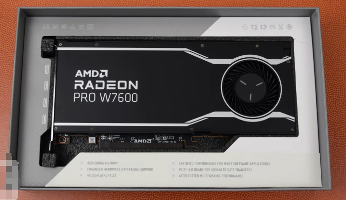 与 Radeon RX 7600 相比,该卡上的端口也略有变化,没有 HDMI 端口和四个 DisplayPort 2.1 连接。Radeon RX 7600 卡上的电源连接可能有所不同,但其中大多数还配备单个 8 针 PCIe 电源连接,而 Radeon Pro W7600 则依赖于单个 6 针 PCIe 电源连接。