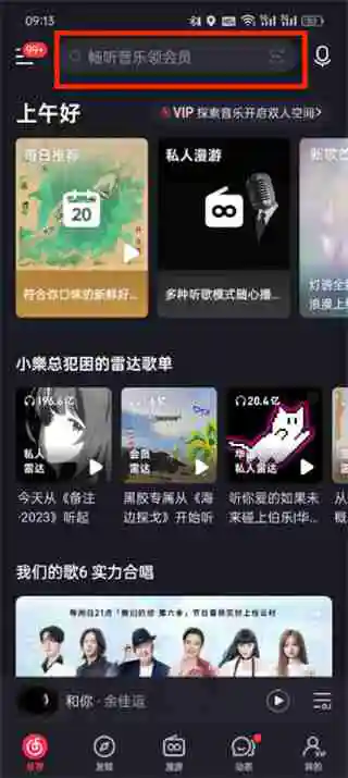 1、首先打开网易云音乐软件,进入到首页中后我们需要点击页面上方的【搜索框】;