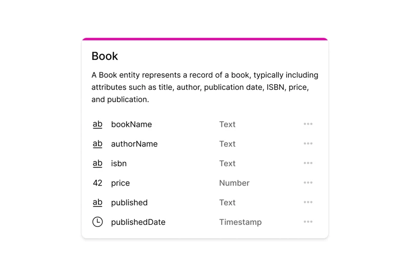 我们采用与 book 实体相同的示例,具有 bookname、authorname、isbn、price、publisheddate、published 属性。