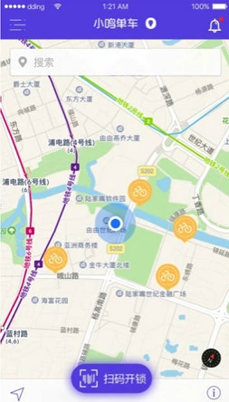 1、打开小鸣单车APP,进入到软件地图主页面,确定你需要开锁的位置,然后点击扫码开锁;
