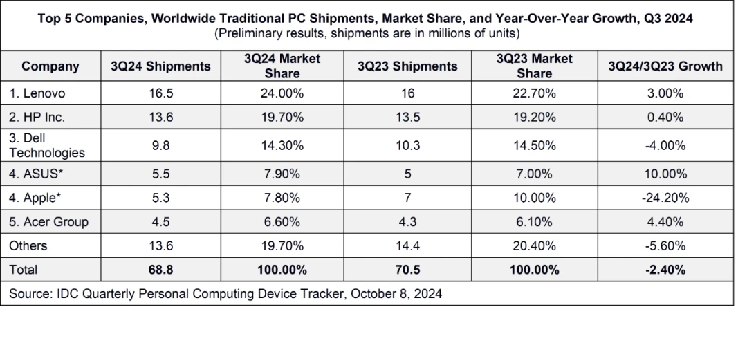 联想:出货量为 1650 万台,市场份额 24%;相比于去年同期的 1600 万台增长了 3%。